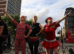 Ok! First check point was (for me) Ion sq E2. A load of us went into ion gardens first before we found where all the boys were hanging out in front of a bbq. We had to burn our bra’s for ten extra points, which I did (much to my chagrin-it was my only good one) and sped off to check point two, bedfford sq. After two trips around I finaly found both of the ladies, had my face “made up” by some delectible tranies and was on my way to the public toilets on broadwick st, W1. Oh my. I found some very drunk north americans, one of which was holding a bag of cut out penises at the bottom of the toilet’s stairs. Once I had grabbed a random penis, I was instructed to place it on the male porn star it belonged to on the huge board of porn stars. Once I had figured out that I was holding it at the wrong angle, I was only moments away from jumping on my bike and heading to wyndham place, w1, where I think I got my favorite question of the evening- “how many shots do you want?” Why oh why did I drink so much whiskey before the race? “three”. Then I had to ride a chopper in a slalom around three trees, ten points added per shot, ten point subtracted per foot down. Then on my own bike and off to see the cuties at south street. I would like to say at this point that I have never waxed any part of my own body before, making the waxing of overdrive’s back my first non-shaving hair removal experience. The less said about this the better, really.